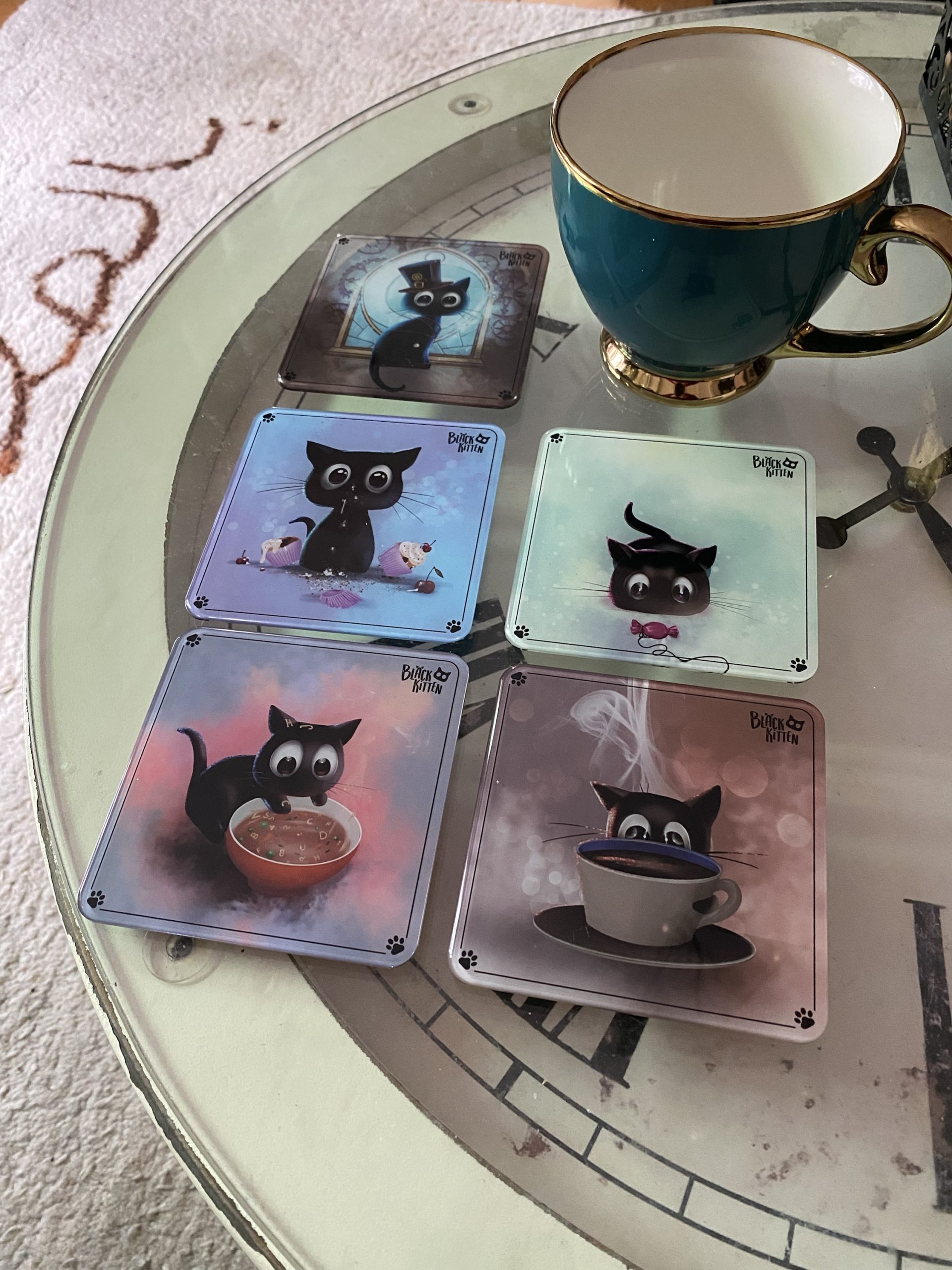 Diese farbenfrohen Untersetzer sind 10*10 cm groß und kommen auf kleinen Gumminoppen daher, damit dein Tisch keine Katzenmusik macht.